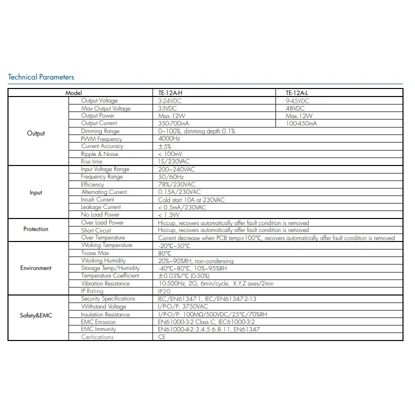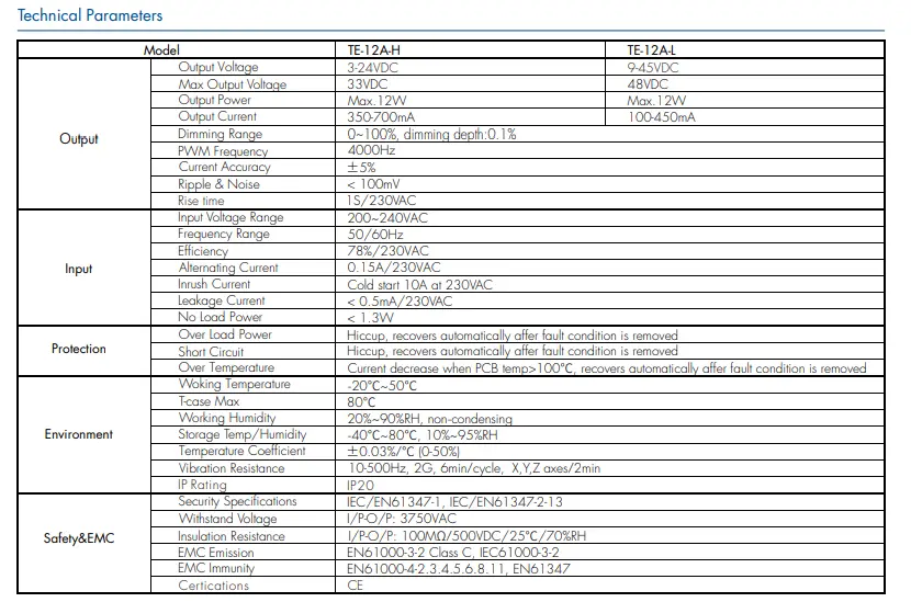 Вхідна напруга: 200-240 В змінного струму 50-60 Гц Вхідний струм: 0,15 А Вихідна потужність: 12 Вт Макс Вихідна напруга: 9~42В Гарантія: 2 роки Сертифікат: CE/RoHS