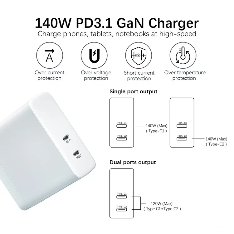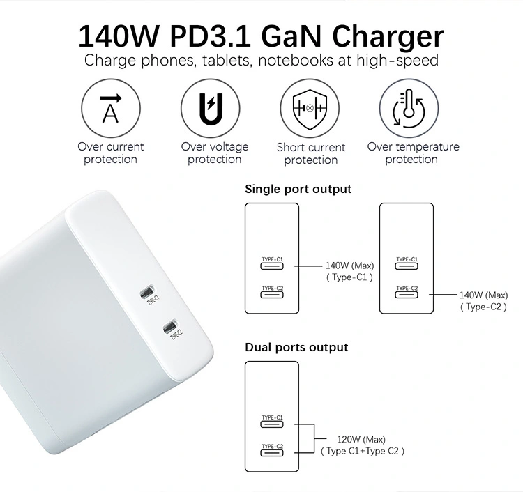 GAN: Завдяки чіпам GaN розмір зарядного пристрою 140 Вт PD зменшено на 50% порівняно з традиційними зарядними пристроями, що дозволяє його легко носити з собою у відрядження або в офіс, не займаючи місця в розетці.