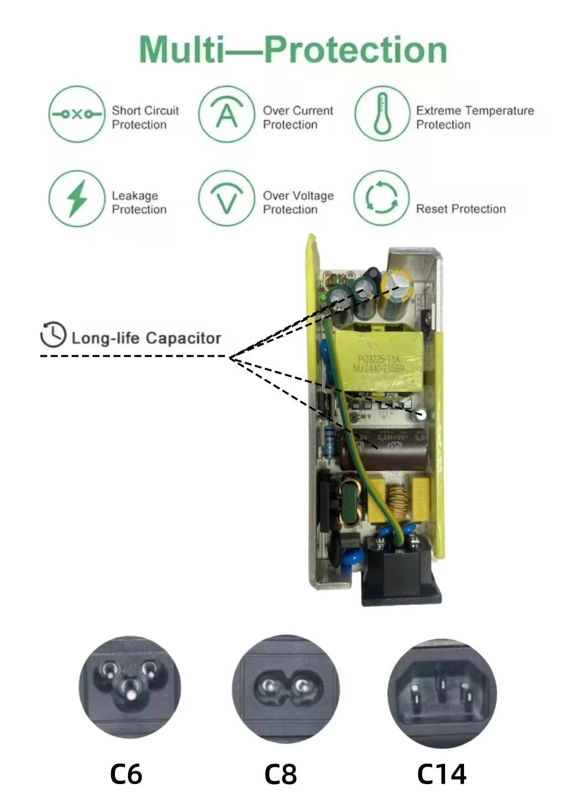 Комплексний захист: інтегровані засоби захисту, включаючи захист від перевантаження по струму (OCP), захист від перенапруги (OVP) і захист від короткого замикання (SCP), запобігають пошкодженню як адаптера, так і вашого цінного обладнання.