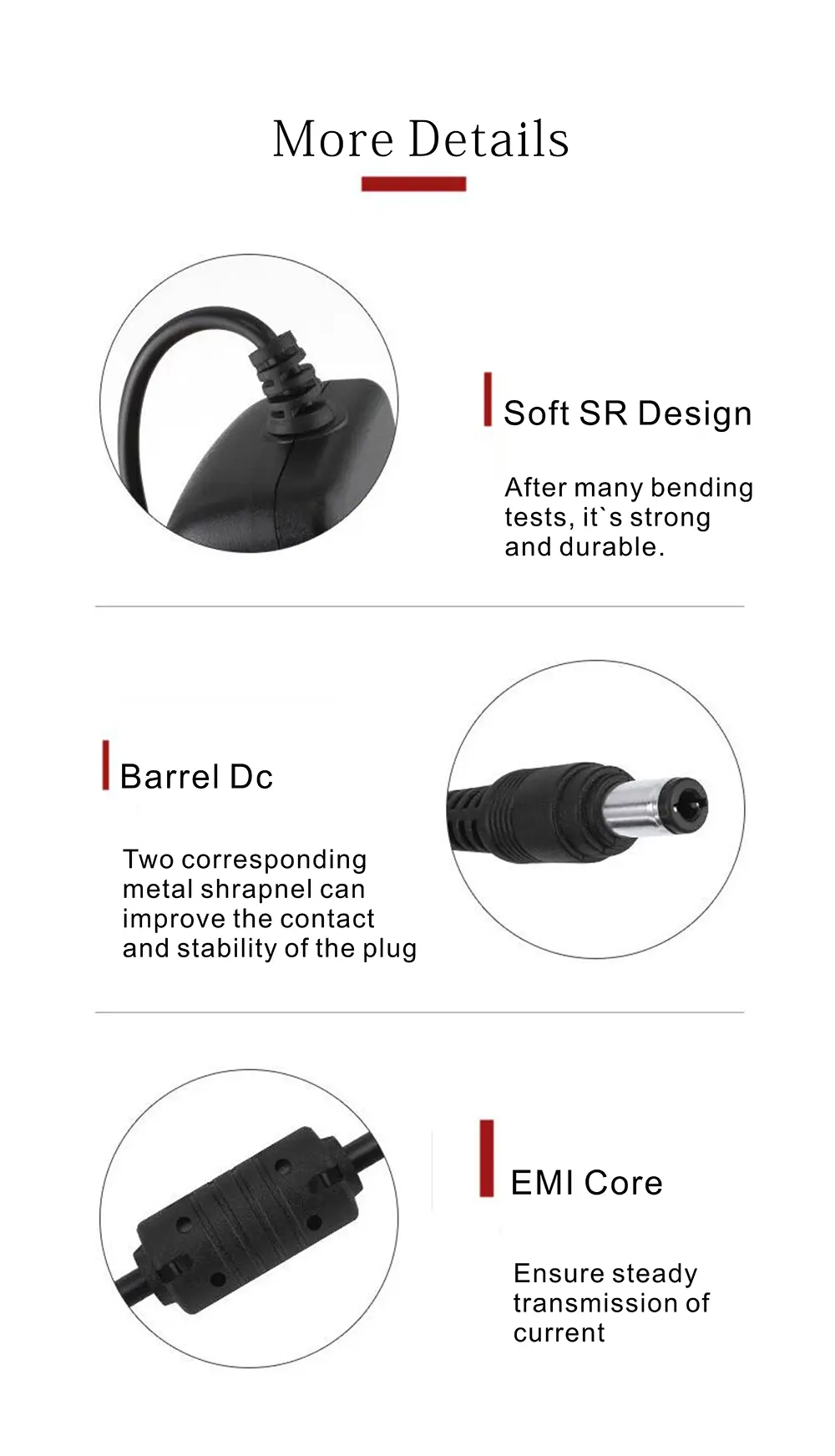 3. Підгонка роз’єму: переконайтеся, що розмір штекера (наприклад, 5,5 мм x 2,1 мм) і полярність (часто позитивна по центру) відповідають роз’єму постійного струму вашого пристрою. Невідповідність може завдати шкоди.