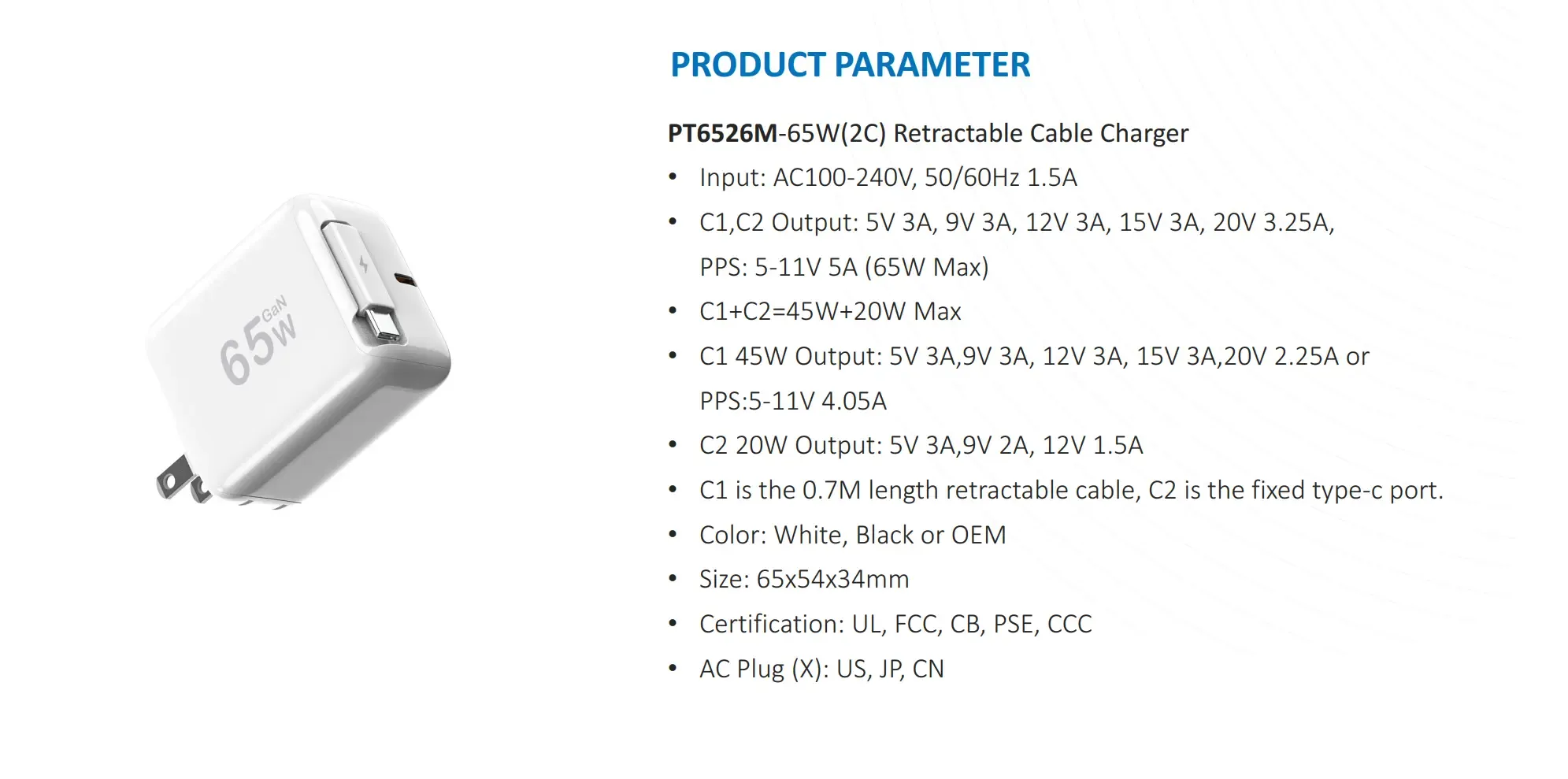 Зарядний пристрій PD на 65 Вт із тягучим кабелем USB c Специфікація: