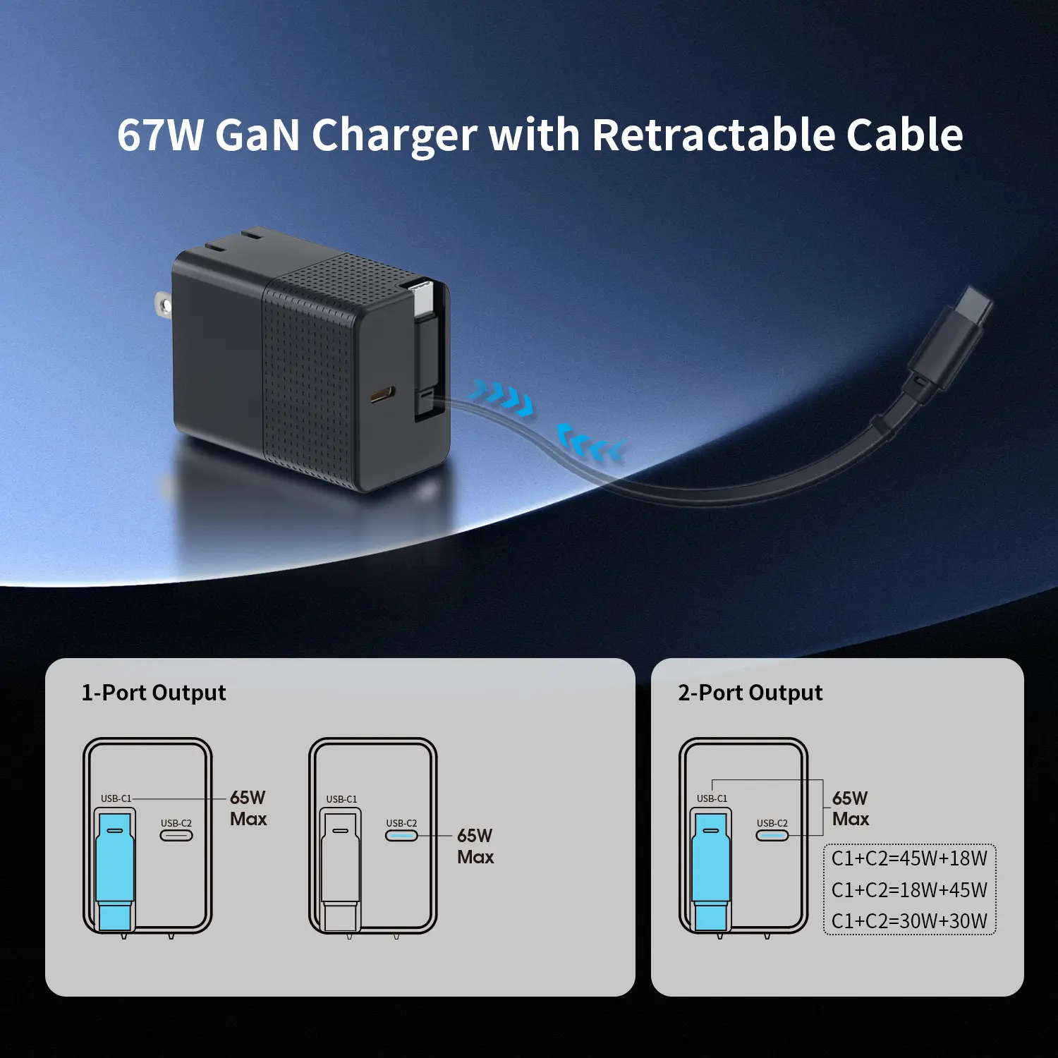 Оснащений висувними кабелями: Адаптер швидкого заряджання потужністю 65 Вт оснащено зручним кабелем передачі даних USB-C довжиною 2,3 фута (1 метр), який не заплутується. Цей кабель можна плавно висувати та втягувати, таким чином уникаючи плутаних кабелів і гарантуючи, що ви можете заряджати в будь-який час.