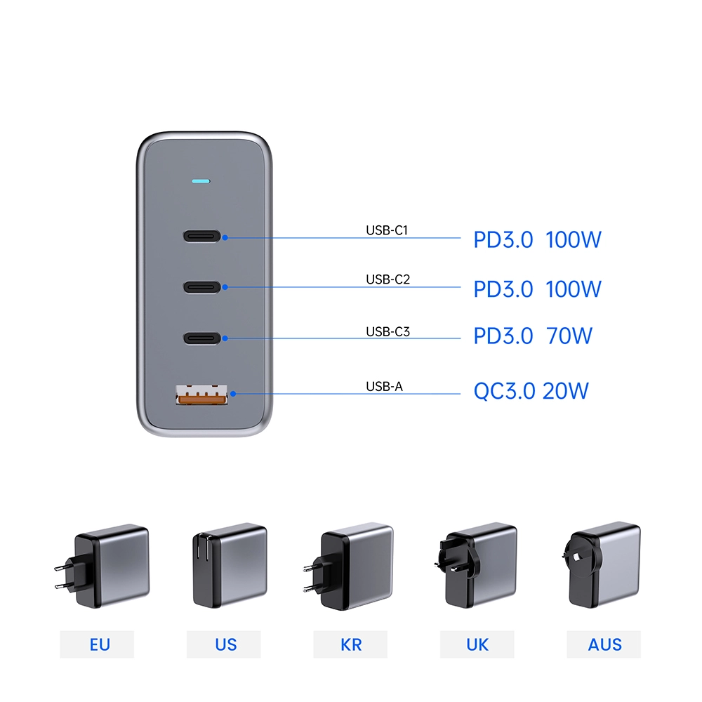 Вихід C1/C2: 5V3A, 9V3A, 12V3A, 15V3A, 20V5A, PPS: 3,3-20V5A (макс. 100 Вт) C3 Вихід: 5V3A, 9V3A, 12V3A, 15V3A, 20V3.5A, (70 Вт Макс.) PPS: 3.3-11V5A Вихід USB-A: 5V3A,9V2A,12V1.67A,SCP:3.3-11V2A (макс. 22 Вт) C1+C2/C1+C3 Потужність: 70 Вт+30 Вт C1+C2+(C3+USB-A) Вихідна потужність: 40 Вт+40 Вт+15 Вт Всього: 100 Вт |